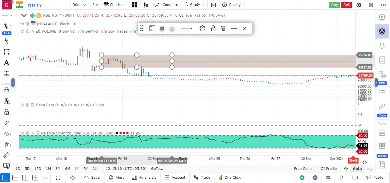 A drawing bar is a toolbar that appears when we add a drawing tool on the chart. It comprises of the most frequently used settings associated with the subject Drawing Tool. This Toolbar is smart enough to toggle visibility on its own depending on your actions on the chart. This toolbar is draggable and has memory coordinates built-in