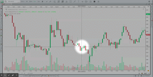 The chart tooltip provides candle level summary as you hover your mouse over a given candle. You can hide/unhide the tooltip by clicking on the Magnifying glass icon