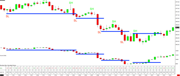 In the above example you will notice every time price breaks a swing low or swing high, delta does as well.
