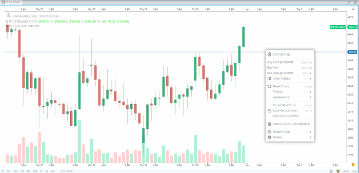 When you right click on the chart a Context Menu will appear. The menu will have smart options on trading to choose from: