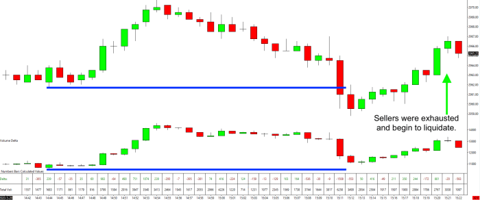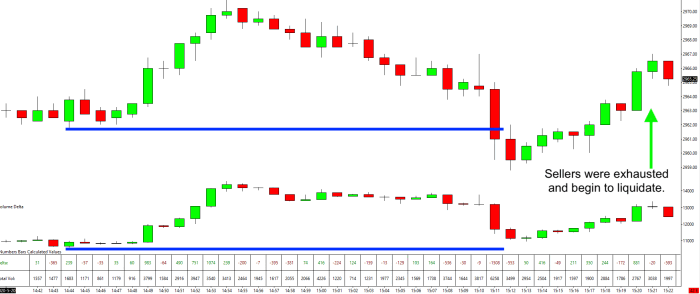 In this example price is now making new lows but delta wasn’t able to. The sellers are now said to be “Exhausted” as they aren’t interested in selling at these new lows.