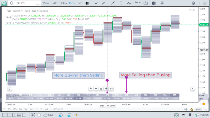 In the below chart, we added the Bar Statistics indicator and added Delta to the candle metrics summary table. We see that when there is more Buying than Selling (Delta=Positive), the price candle is Green and when there is more Selling than Buying (Delta=Negative), the price candle is Red.